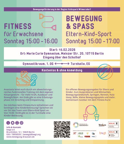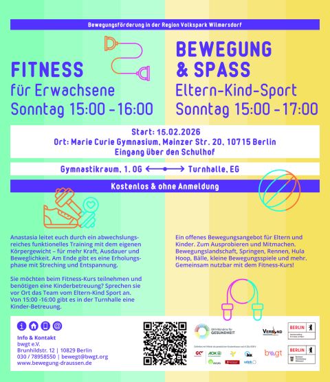 Nach Absprache können Ihre Kinder von 15:00 -16:00 beim Eltern-Kind Sport betreut werden.